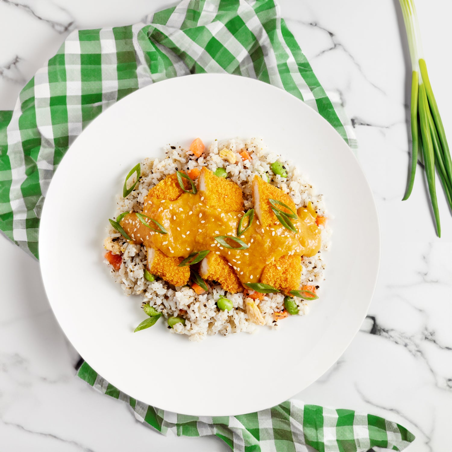 Katsu is a Japanese classic that’s been around and loved by everyone for centuries, now we’re bringing it to your doorstep! Rich & flavourful gravy with the sweetness of apple, over a panko-crumbed Chicken Breast atop a bed of fried rice loaded with Tamagoyaki egg omelette, seaweed, edamame beans, sesame, and a variety of all-important veggies! Yum!