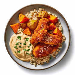 Complete your meal with our vibrant and punchy Jambalaya rice and roasted sweet potato, and you'll be left completely satisfied. Our homemade Southern Fried Chicken is a dish that's sure to please, leaving you craving for more.
